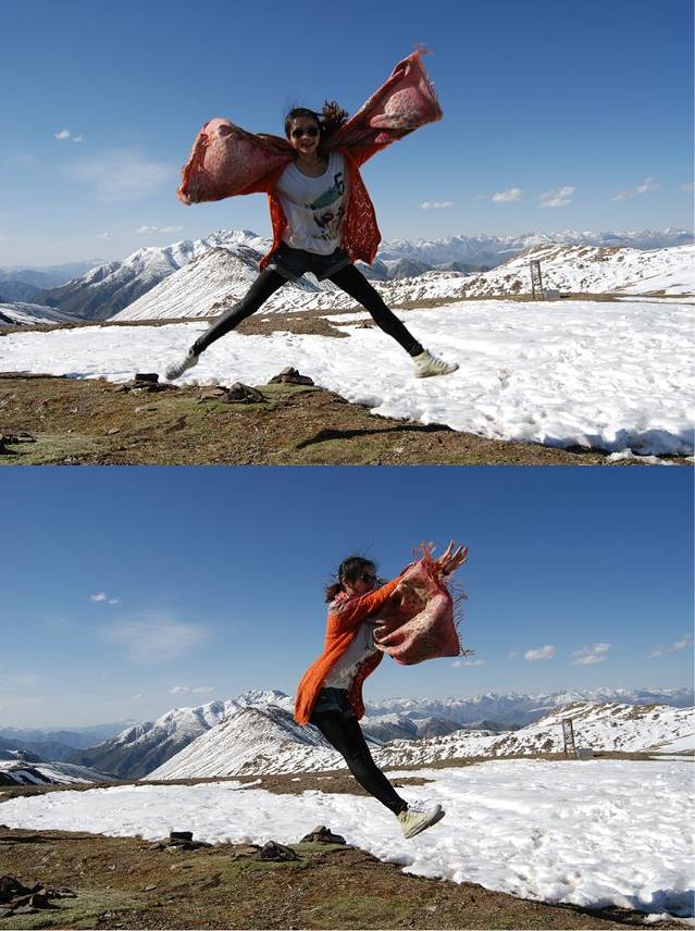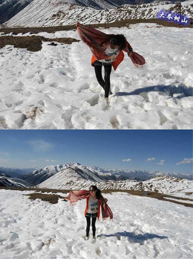 从拉鸡山下来没多远,我们又被一段无人的公路吸引下车拍照,远处就是雪山,公路上随便你躺着卧着的拍照~这个地方已经避开了风口,所以冷得可以忍受,呵呵。