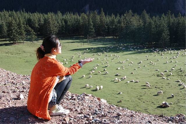 因为我们下到了牧场,那群可爱的羊都跑到后面去了,后面白色的一片全是羊群