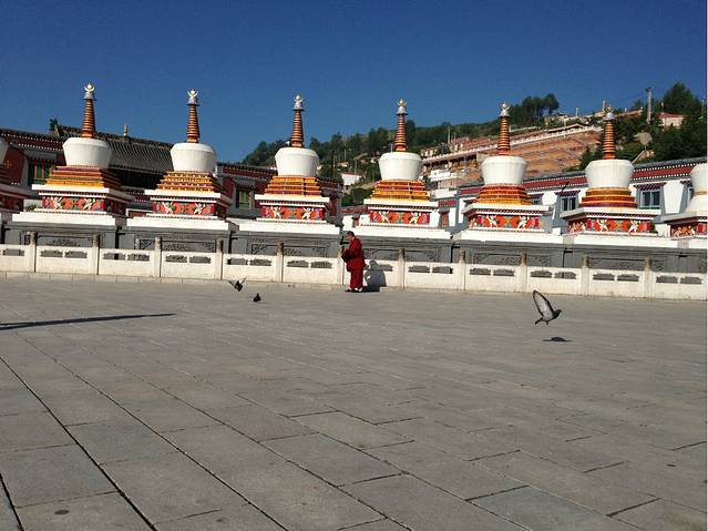 朝阳下的塔尔寺、喇嘛和鸽子,多和谐的画面啊
