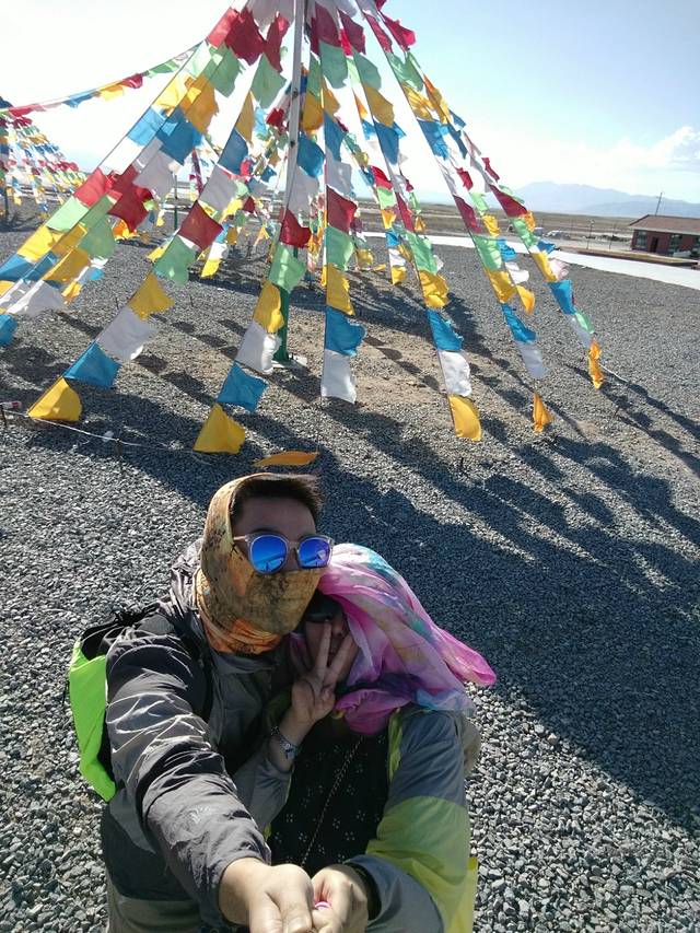 之前塔尔寺等其他游客,耽误了时间,到茶卡时已经下午五点多了,虽然太阳依旧毒辣,但是感觉错过了最好的日照时间,湖面反射不是很漂亮了。太阳太足了,两个人包裹的严严实实的。