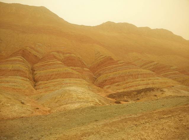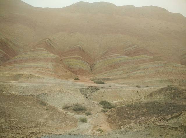 张掖的七彩丹霞是我这次行程中最失望的一个地方,原因无他,风沙天气,能见度低的不能再低。给你们看看皂片感受下。和网上的七彩丹霞简直是天壤之别,一路上安慰自己,还好,还有机会来,下次去敦煌、去嘉峪关还会来这里
