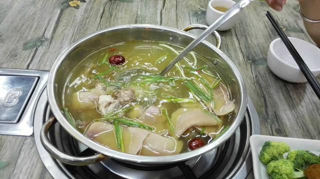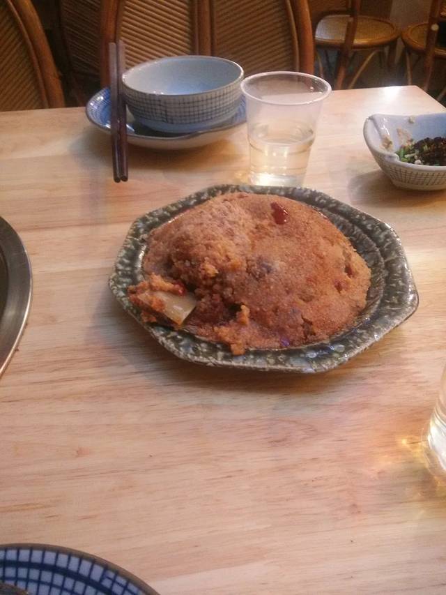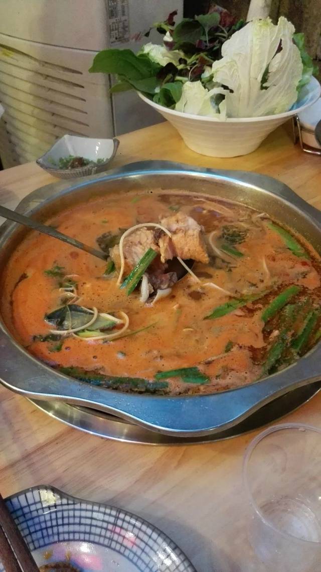 5点多坐车回云岩区吃酸汤鱼,坐了将近1个半小时公交然后打车去的。贵州同事说“爽爽的贵阳,堵车的天堂。”,很是精辟啊。。。门口已经有很多人在等,我们才两个人,很幸运地不用等就进去了,98元一斤的野生乌江鱼,两个人点了一斤半。一篮子青菜10元,再加一碟粉蒸排骨28还是38来着。酸汤鱼很好吃,汤也超级好喝的啊,酸的,不辣。热火朝天地吃到一半,穿着苗服的女店员开始跳舞,顿时觉得一天的劳累都烟消云散了啊。推荐推荐。两个人吃了200左右。