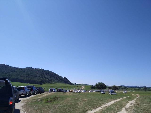 太阳完全升起,气温回暖日照充足,微微有风不是很热。早餐过后,随团一起搭乘当地人的车深入草原。一辆车除了开车的牧民外一共是四个人,给我们开车的牧民是个矮个子的大爷,车队还没出发时我看他给我的感觉就是“率性洒脱”的那种,果不其然!车开出去十来分钟我就已经被晃得七荤八素的了...哪里坐过这样的车么!有坑也不躲,有石子路也不减速,看见陡坡泥潭就咻地加速往前冲,窗外被车轮扬起的尘土漫天飞,就这大爷还一个劲儿地往前冲,草原儿女果真一个率性了得!好性情啊!开车全程约四个小时,我前半程还不适应,到后面就觉得坐这样的车还真挺刺激的!大爷真是太可爱了!(主要是路况特殊,平时开车还是要遵纪守法稳稳地开啊!)