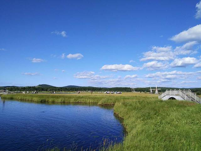 七星湖景区,天空蓝得透亮与澄澈的湖水呼应起来,蓝天草原的交界处有隆起的小山丘,走在木头栈道上,竟教人有置身童话幻境的错觉。