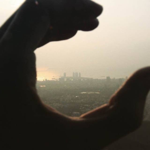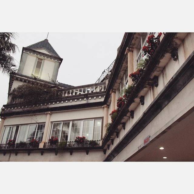 酒店的高楼阳台微凉的天气下俯瞰金黄色的街道和断断续续的人流和喇叭声