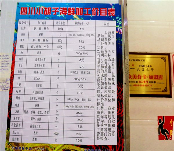 等海鲜上桌的间隙看了一下店里,客人挺多的,还有不少人排队,这家店的生意还真是好。还发现墙上贴了好多牌牌,有荣誉牌,有合作牌,还有加工费价格表,加工费就按表格上的价格来收,还挺透明。