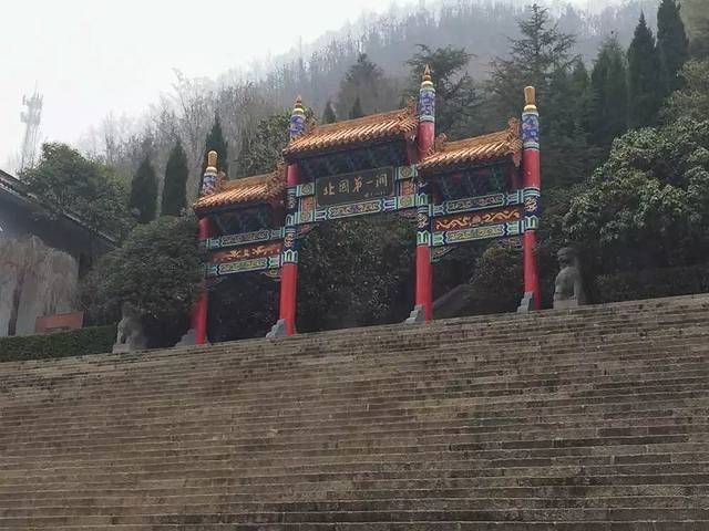 从售票厅到山门口是可以坐车上来的,票价也不贵。但是男票是退伍军人、我又是导游,感觉体力都不错,加上年轻气盛吧,于是就任性的选择了步行。有点后悔啊,并没有我们想象的那么近,而且都是上坡路,感觉有点儿累,不过没想到老天和我们开了个天大的玩笑,更累更惊险刺激的还在后面。一路上我都在想,如果今天开车出来就好了,可惜啊,车子被借走了,真是欲哭无泪。从这张图可以看到后面的山门了,在这里凭大门票或者有效证件进入景区。