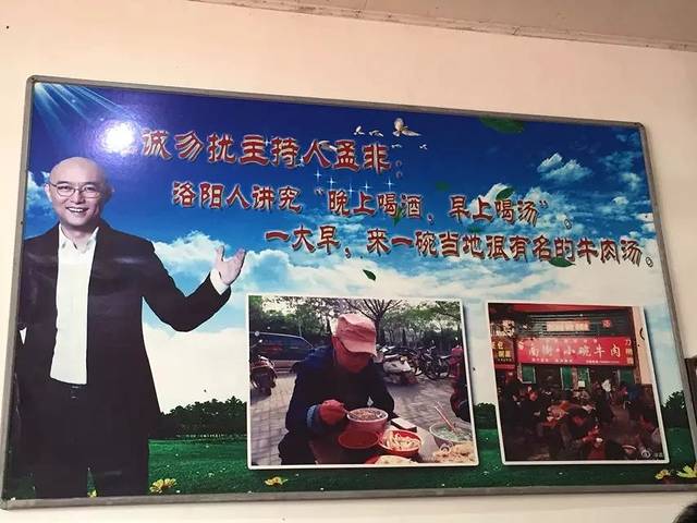 店里挂着这张大牌子,哈哈,所谓的明星效应嘛。据说《非诚勿扰》的主持人孟非也在这家店喝过牛肉汤,孟爷爷对这家店的牛肉汤颇有赞许。洛阳人讲究“晚上喝酒,早上喝汤”。早上来一碗当地很有名的牛肉汤,感觉棒棒哒。