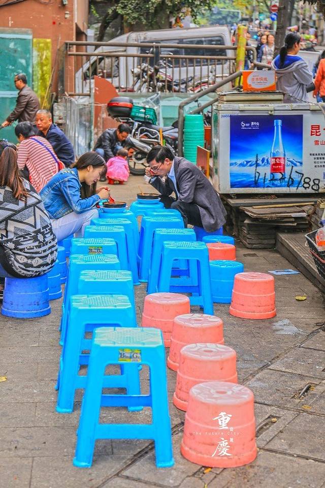 大家都用板凳当桌子,坐着吃面。~