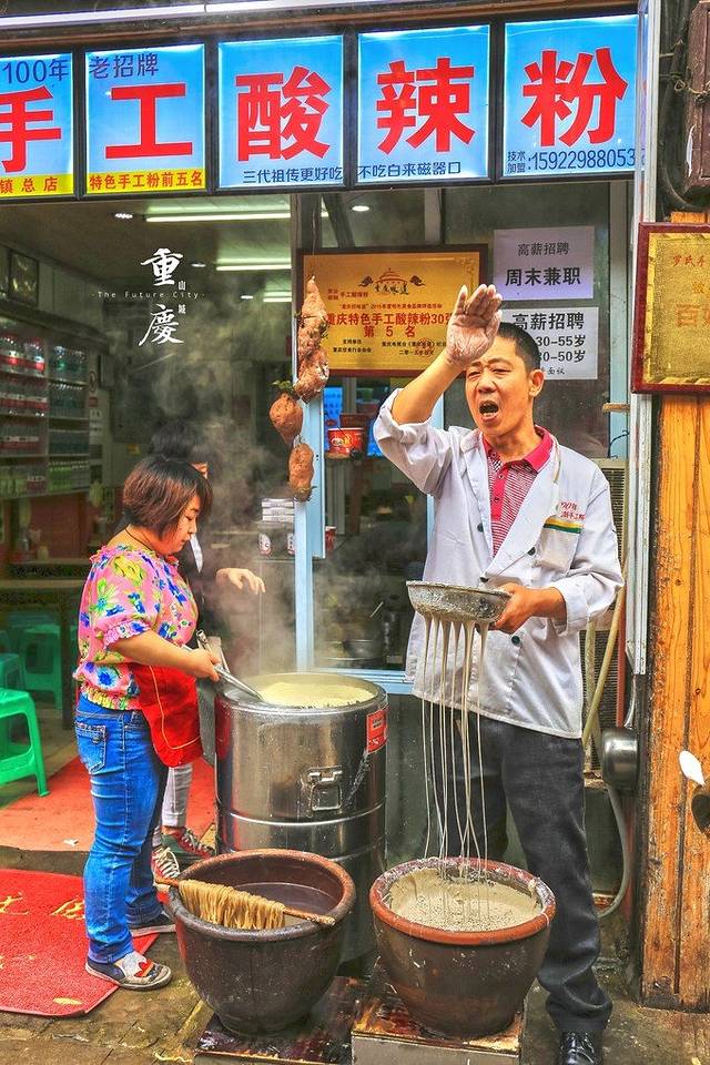 相信这个大叔很多人去磁器口都见过啦,他家的酸辣粉蛮有名的。大叔的段子也是一个接一个的,说的非常溜。