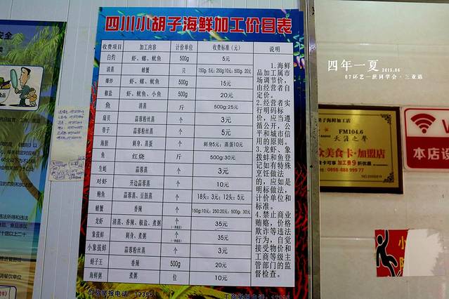 逛了几圈买好海鲜就回店里加工啦~小胡子海鲜店的加工费价格表贴在墙上了,一目了然,很是放心。
