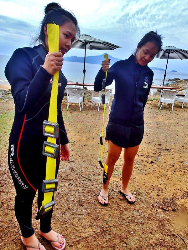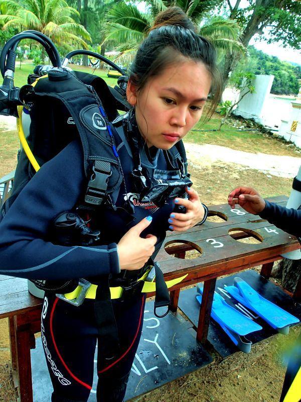 第一次穿戴潜水设备,心里面还有些小激动啊!教练教我们认识了一下潜水装备,如果是浮潜,只 要装备潜水三宝———面镜、呼吸管和脚蹼就可以了,或穿上稍薄的保暖潜水衣。如果是水肺潜水(深潜),则还要配备以下装备:浮力补偿背心(BCD)、呼吸调节器、潜水湿衣、气瓶等。我们学习的OW当然属于深浅,整理好装备,准备出发!