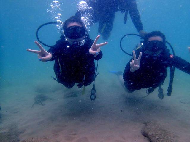 到达指定地点后,在教练的指导下穿好装备,准备第一次的潜水!