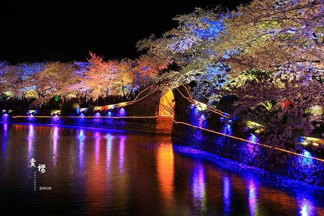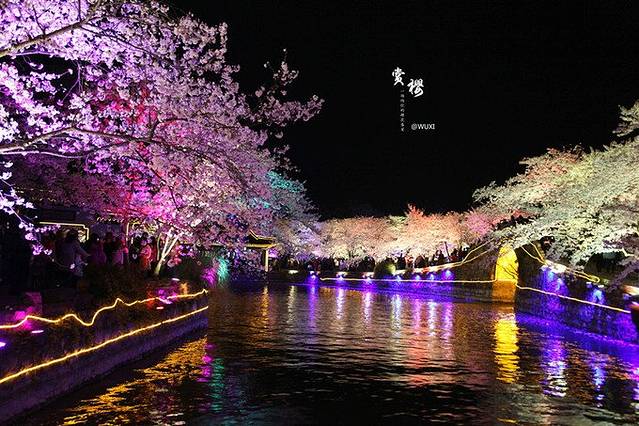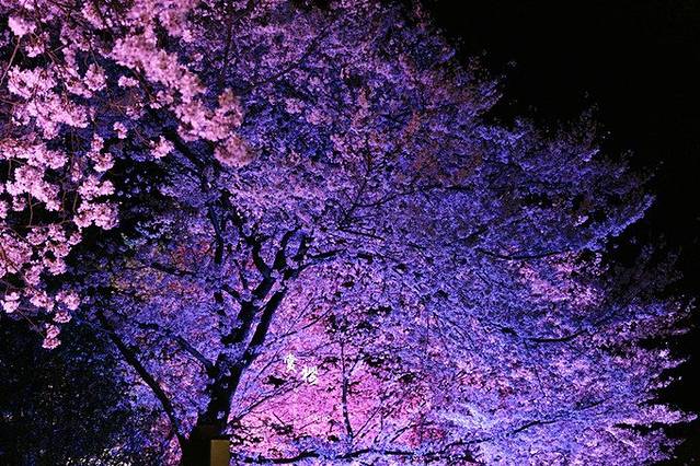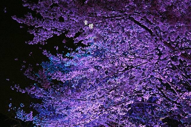 夜樱是前年开始的,想出这招的人还挺聪明的,把赏樱时间延长了几个小时,彩色的灯光打在樱花浅红色的花瓣上,呈现出梦幻般的奇妙色彩