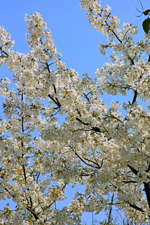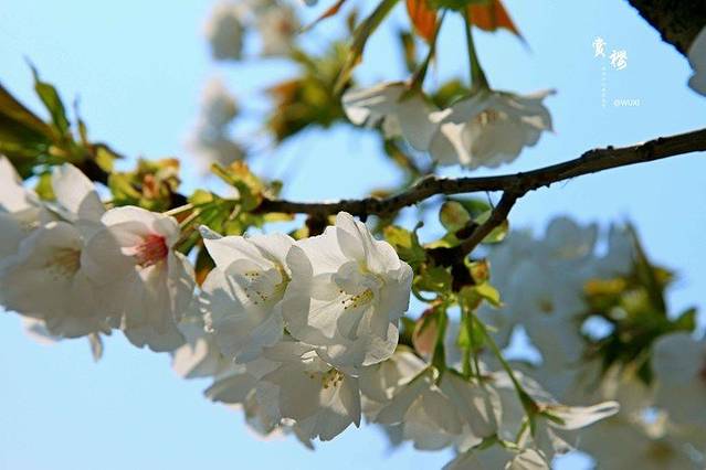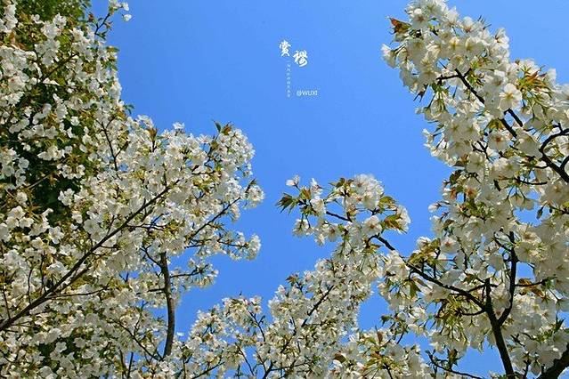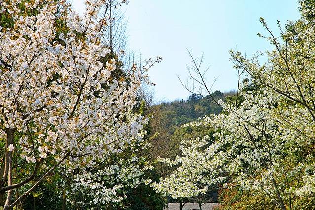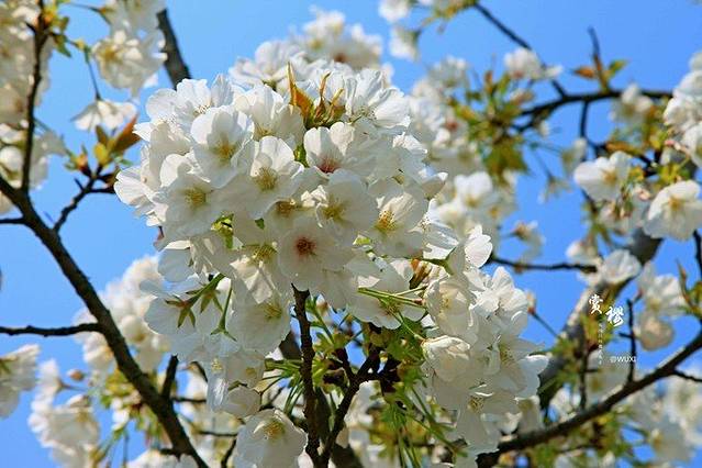 里面的樱花都是白色的,衬着蓝蓝的天很好看