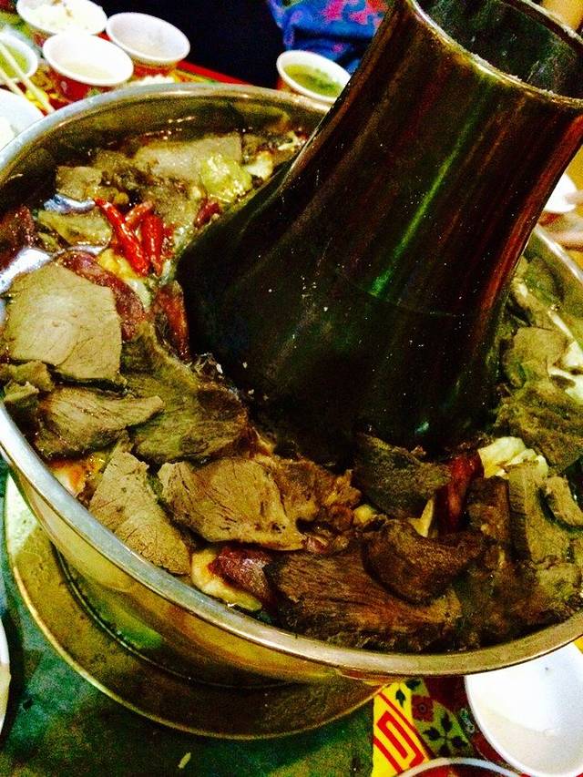 藏式火锅标配:酥油茶、牦牛酸奶、青稞酒、牦牛肉、羊肉及各种蔬菜肉类。当天吃完也参加了篝火晚会~~