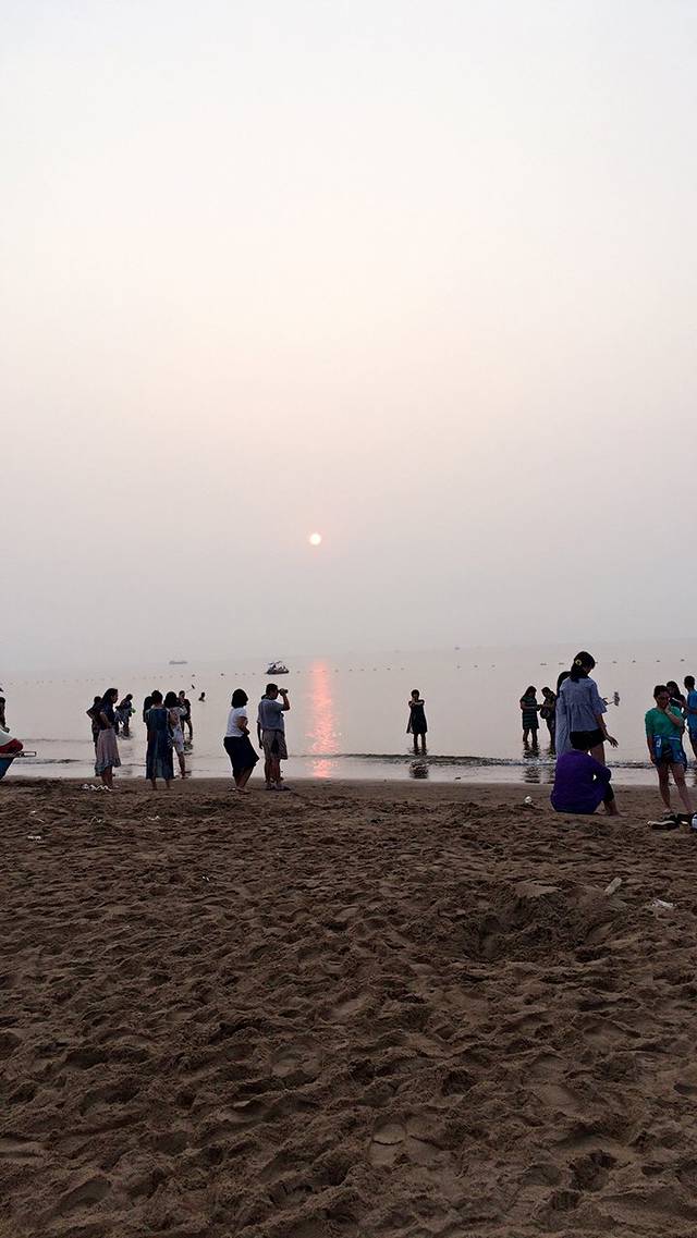 放好行李就去海边走了一会,十点多人也很多,这附近都是宾馆,所以来的也全是游客。第一次来海边心情很好。晚上也有游泳的。沙滩上的沙子很细软一点都不硌脚。商量好第二天早起四五点钟看日出……