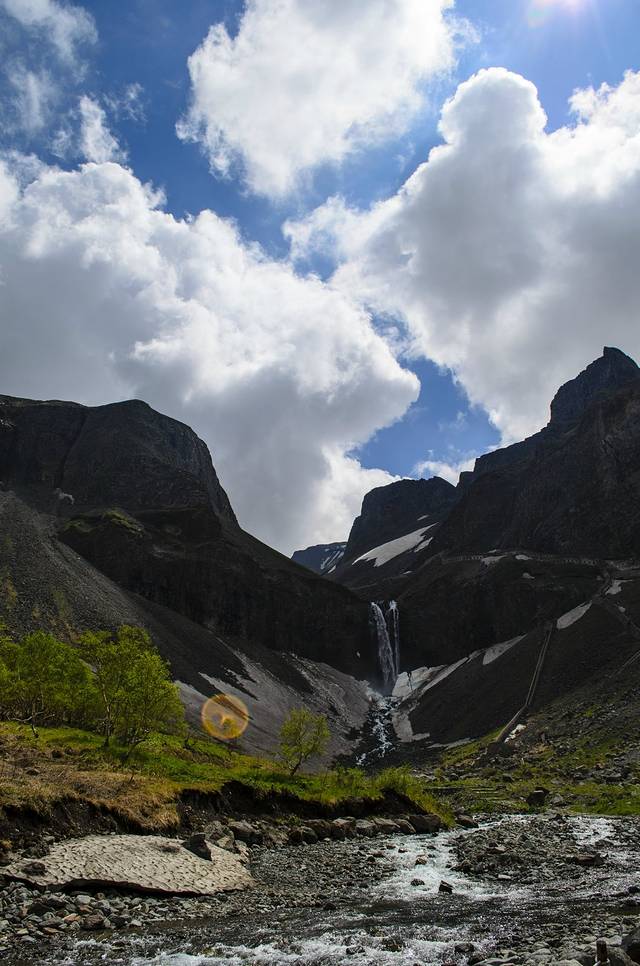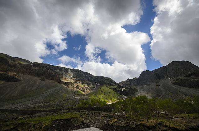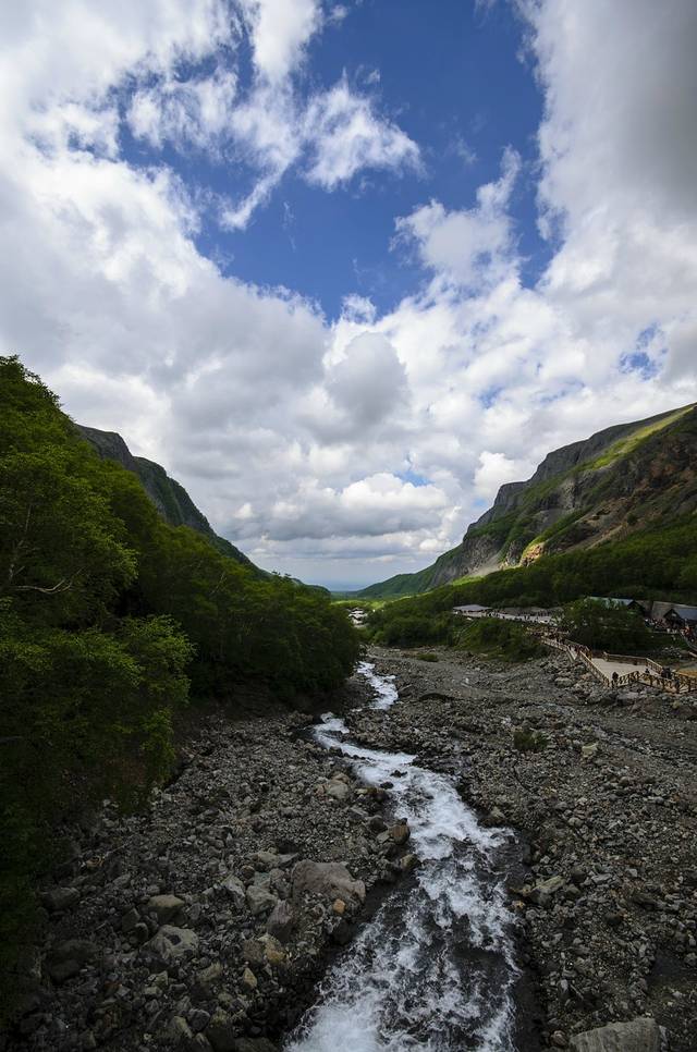 两侧的高山之间,是峡谷一般的通道。浅浅的溪流在山间静静流淌,依水而修的栈道缓缓而上。天边厚厚的云层像棉花糖一样可爱。
