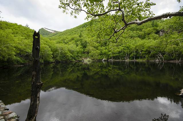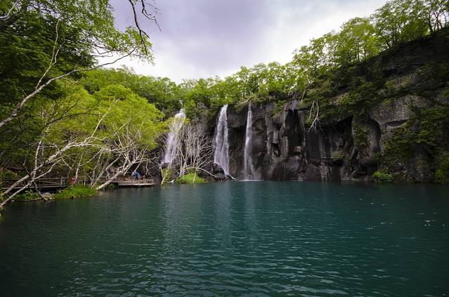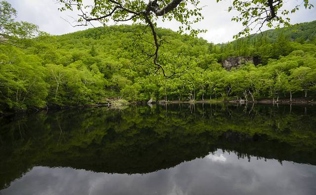 绿渊潭因池水碧绿深窘而得名。绿渊潭内也有一小型瀑布,最高落差达26米,瀑水落于巨石而四渐,而后流入深潭。每逢雾起,潭上水雾弥漫,与高山岳桦、旷古巨石浑然而一体,宛若仙境。