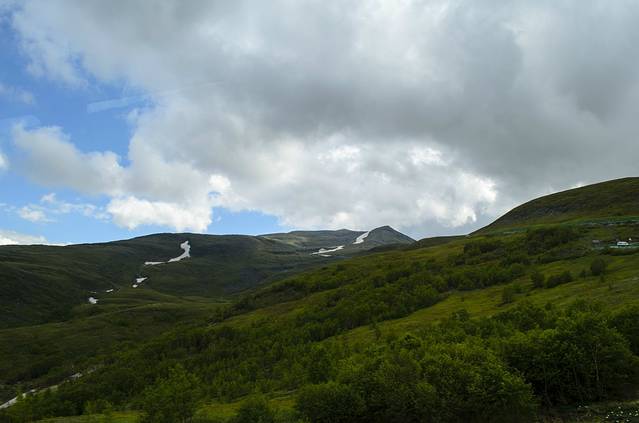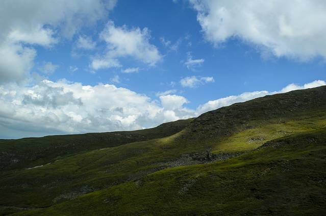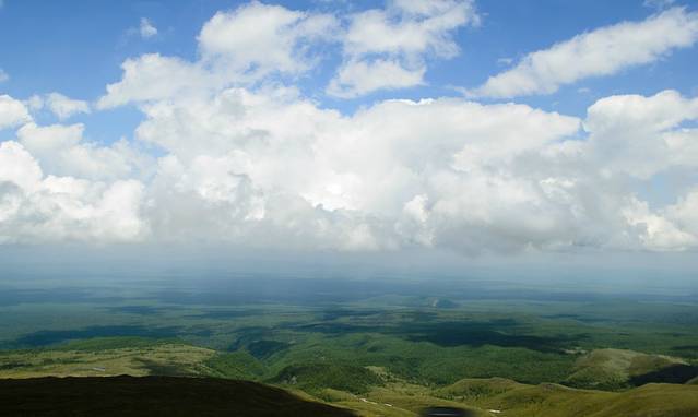 前往天池的道路开阔而平坦,一望无际的绿色和被大朵白云覆盖的蓝天让人应接不暇。