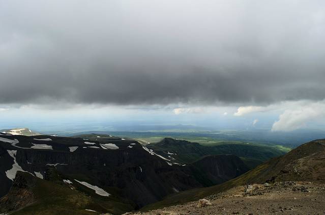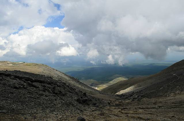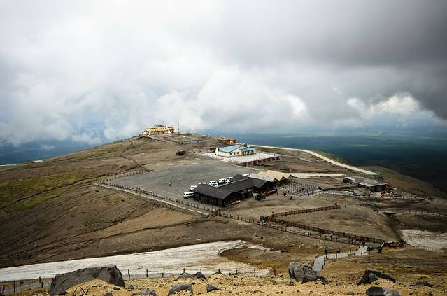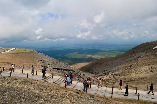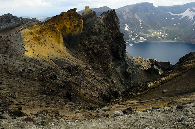 我们在一处略显荒芜的停车场下车。周围是少有植被覆盖的棕褐色土地,地面上有着大小不一的碎石与大石块,仿佛西北的戈壁滩。山顶的天空有些阴沉,不过看看从天池下来的游客的神情与精神状态,应该还是可以看得到天池的。哦对了差点忘了说,每年的6-9月是最适宜来长白山旅游的季节,只要没有强降雨,天池一般都不会被迷雾笼罩。