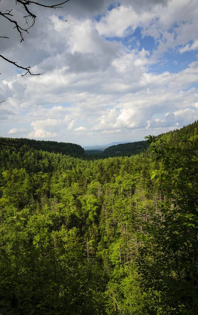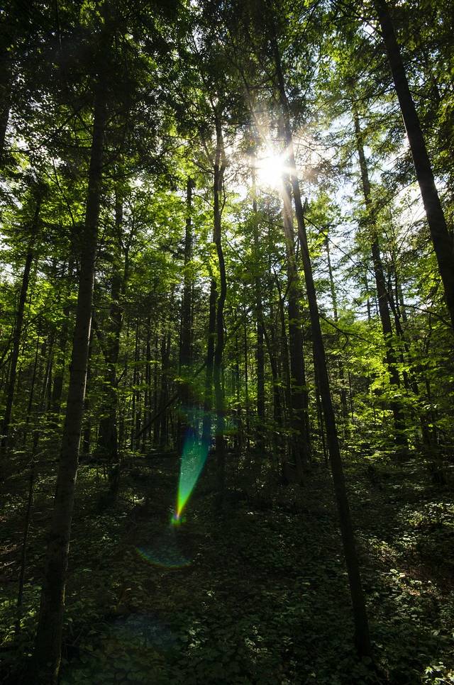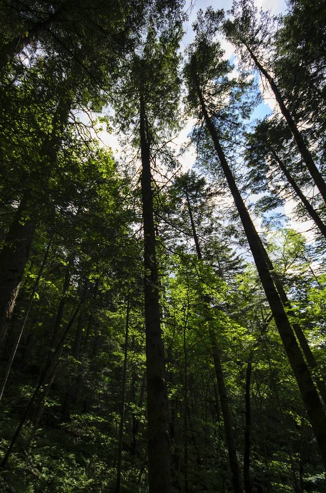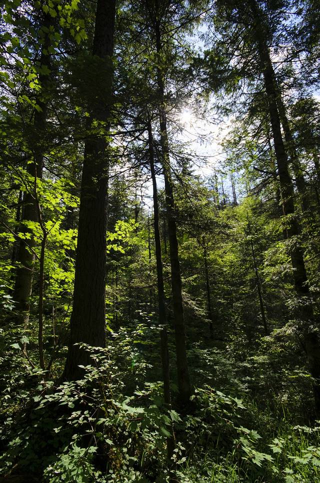 林中古树参天树木密集,阳光经过密密麻麻的树冠的过滤,都很难照射到森林的地面,这使得林中幽暗无比,斑驳的树影为这里增添了不少神秘气息。由于气候原因,这里的森林多为耐寒的针叶林,所以即使是底层植物,也依然郁郁葱葱。林中生态系统保护完好,时不时能见到不少稀奇古怪的虫子,栈道旁还立有提醒游客注意动物出没的告示牌。