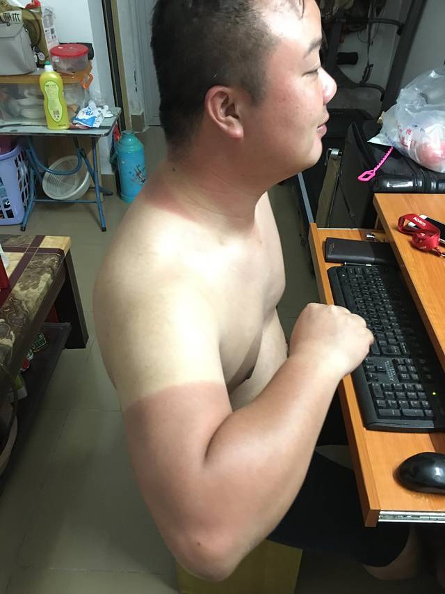 如果不准备一下,就会像我下面这个样子,男士们无所谓,美女们估计不想成为我这样吧,特别说明一下,这次我们在海边玩了一天,没有太阳,还下了雨,不知道是海风还是紫外线的原因,反正我成了这样了。
