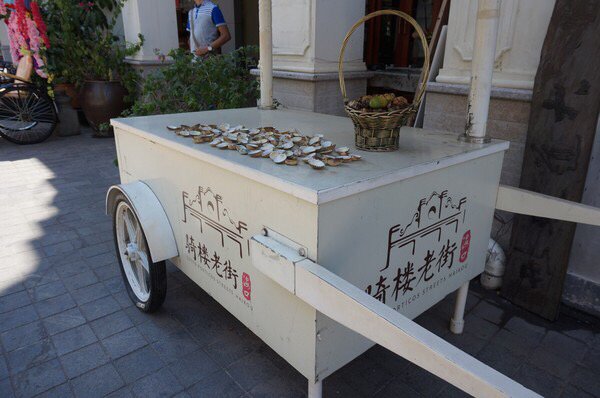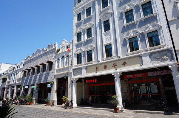 这里有很多老街老巷包围起来的一片老城区,虽然还有不少的楼在拆迁改造,但是已经有一条主干道改造完毕成为真正的步行特色街。早晨还是大家吃早茶的时光,我们趁着没什么人来这里拍照留念。两边的楼已经粉刷成统一的白色,骑楼建筑是20世纪初华侨借鉴南洋建筑风格,楼层多为两三层,布满精致的雕花和洋气的装饰,大多仍保留着早前的老字号商铺,极具传统特色。