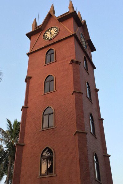 海口钟楼位于去往海甸岛的人民大桥旁边的入海口,依街傍水,景致十分幽雅,被列为海口八景之一。傍晚来往的船、客轮宿靠堤边,夕阳残照,波光粼粼,更添几分姿色。6层钢筋混凝结构建筑,外貌雄伟壮观,顶层的钟表每30分钟报时一次