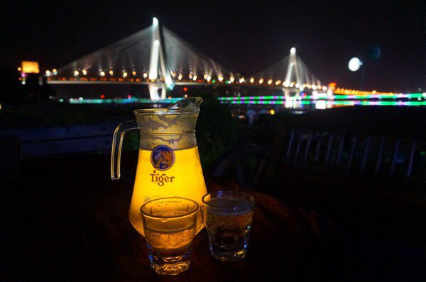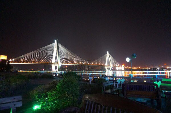 地点在海甸岛碧海大道的揽海大酒店院内,虽说不太好找但是经熟人指点后很快就找到了。环境真的是没的说,晚上坐在海边,看着世纪大桥的夜景,吹着小风,听着音乐,吃着烤串,喝着啤酒,聊着天,夜生活从晚上九点才刚刚开始。估计位置太好了价格就贵,肉串25六串,蟹棒25四串,玉米20两小段。啤酒还不错,胜在情调和环境了,晚上蚊子很多,注意喷花露水。