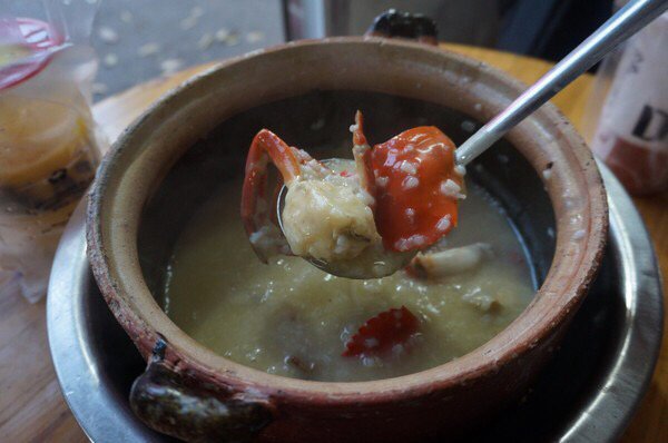 地点在海甸岛海达路,即使是一家环境相当简陋的苍蝇馆子,每到晚上就人开始爆满,原因很简单就是他家的蟹粥味道实在太正宗太地道太好喝了。当地人推荐的,要不然外地游客根本不会找到的。两个人的话老板娘推荐选了一只大膏蟹。煮出来一大锅慢慢享受,蟹肉肥满,粥也很入味,鲜美浓郁,不愧为是海南的一大特色风味小吃,原因就是海南盛产螃蟹,蟹肉中含有磷、钾、钙、蛋白质和多种氨基酸,营养丰富,有“补骨髓,滋肝阴,充胃液,养筋活血,治疽愈核”之功效。人均50,就是得注意一下环境卫生,最好装修一下,这样才能打出名声,更吸引外地游客。晚上六点才开始开餐,一般夜宵持续到很晚。
