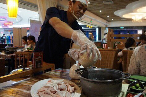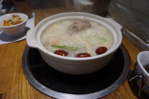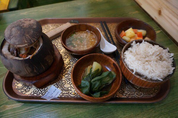 两个人来大地看电影正好看到了大众有团购,4.8号最后一天五折优惠,满100减50还可以叠加使用,于是就来吃心水好久的原味主张椰子鸡。环境很好超有海南岛特色,服务员穿的也是岛服。原味椰子鸡148一锅,锅底是三个椰子的椰子汁加一瓶矿泉水,等水开了就可以直接把白鸡下锅,再开锅五分钟即可以食用。蘸料三元一位,是酱油挤点金桔,辣椒还是有点辣的。这样煮出来的鸡虽然比较清淡,但是有淡淡的椰子甜味,也不同于北方炖出来的鸡肉口感。舀出一碗煮出鸡汁的甜汤,味道特别棒。主食点的是超级腊味饭,腊肉和腊肠的味道都沁入米饭中,大概的份量是四小碗,两个人最后吃的特别撑。