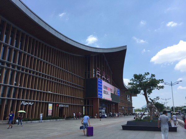 三亚火车站,位于三亚市吉阳区,是海南岛东、西环铁路闭合点,也是海南最南边的一座火车站,2010年建成,也是隶属于广铁集团。很有风格的建筑,象征波浪的屋檐。门口广场就有坐公交和打车的站点,很有序。