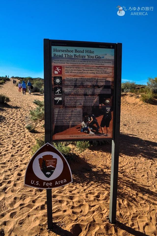 注意:最好穿运动鞋,一路徒步的沙子地比较软,有些岩石的地方还会滑,另外最好带上防晒和水,我们到了这个牌子以为沿着这个土坡上到顶就是马蹄湾。。。。千万不能自以为是啊。。。。路程还很远啊 最起码要走20分钟以上。。。最后走回来又像死亡逃离一样奔到车上喝水。。。。