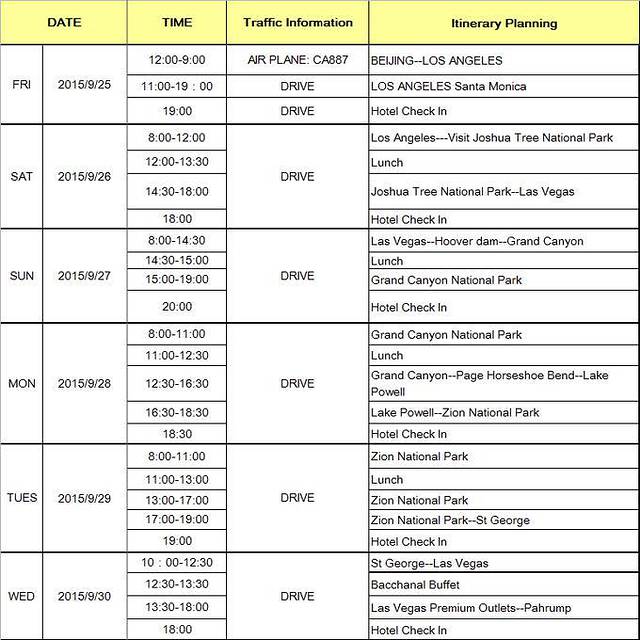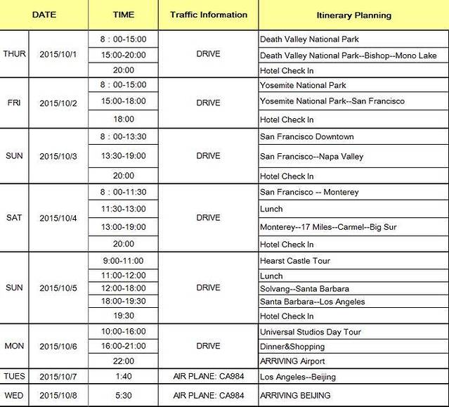 美国行第一项准备的就是行程,从春节回来我就陆陆续续开始制定行程,每周都会抽出时间研究LP、GOOGLE地图和一些大神的游记,根据每天的行驶路程(原则每天不超400KM),先定下了全程14天大概每天晚上的落脚处,然后在LP和游记中挑选感兴趣的点,根据地图安排行程,到最终敲定中间改了N版,以下是后来办签证使用的简版行程。当然实际的行程和此版稍有出入,不过大部分是一样的~