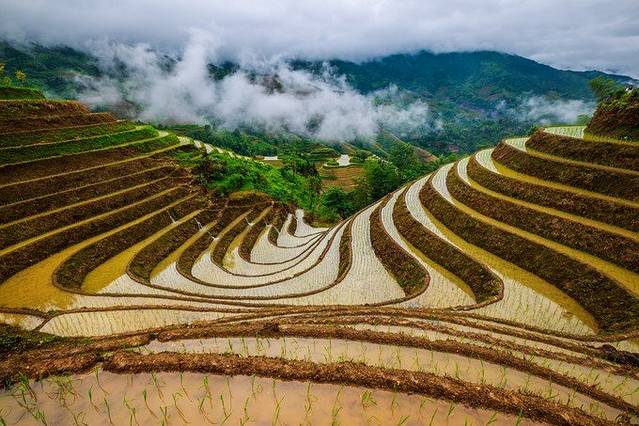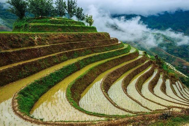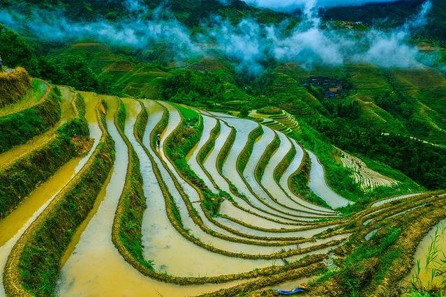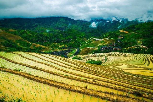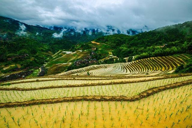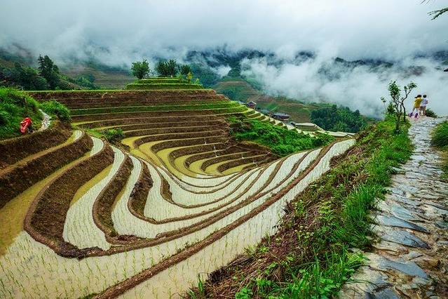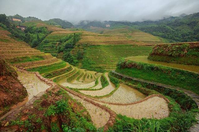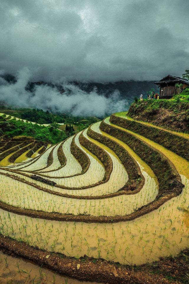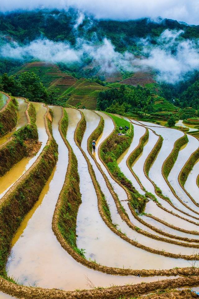 来到景区门口,一下车就有好多婆婆围过来,强烈要求背行李,没有问价钱,因为我们人多,1米8的大个子也不需要别人来背......进了景区,先来一张仰视图,因为是汛期,所以天气都是阴天,水也很浑,但是毫不影响梯田的雄壮。