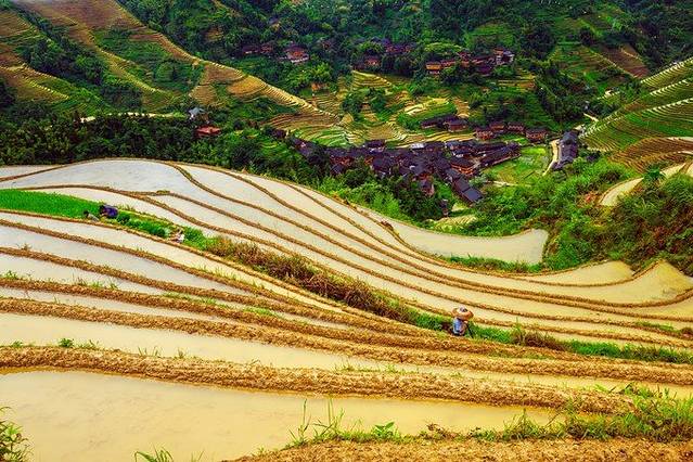 梯田五月下旬是灌水的季节,这个季节是摄影爱好者的季节,因为稻田的水面反光,很多大片都是这时出的。我们是6月12号来的,不知道是不是雨量充沛,梯田里的水都很充足,道路也比较泥泞,还好上山前准备了凉拖鞋