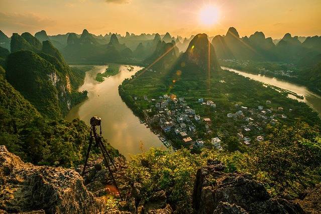 来到兴坪大概下午三点多,带上相机就出发了,山路不好走,而且感觉阴森森的,后来遇到一位老伯,60多岁了,今天第二次来山上拍照,可见景色有多美了,跟着老伯走,老伯走的很快,我甚至有些跟不上了,真是老当益壮。我问为什么不修一个好点的山路,老伯说,原来老寨山没有路,有个日本年轻人,来阳朔旅游,爬上老寨山,看到了绝美的风景,回到日本后,还是念念不忘这里,带着积蓄回来,在山上修了一条石板路,娶了当地的姑娘,在山下开了一间旅社,叫做老寨山旅馆,这也算是老寨山的一个小故事。