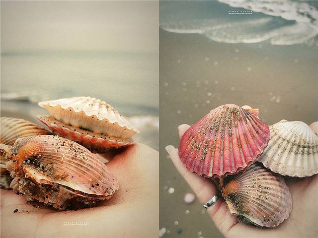 阴天下雨使天黑得格外迅速,在沙滩上走一走,发现了好多被海浪冲上沙滩的栉孔扇贝,粉色紫色的贝壳很漂亮,而且是活的,活的哟,我和我老爸就抓了好多,收获颇丰。