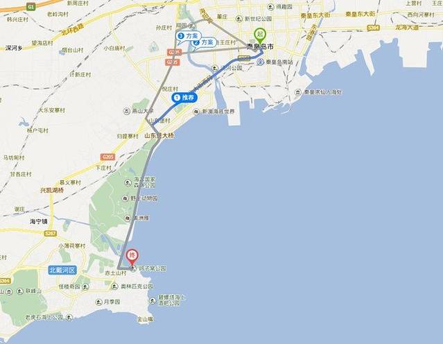 导航查了一下到秦皇岛市的路线,一个小时车程,46.8公里,就一直沿着新修好的滨海新大道走,路宽没什么车,超好走。