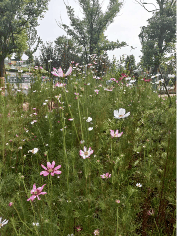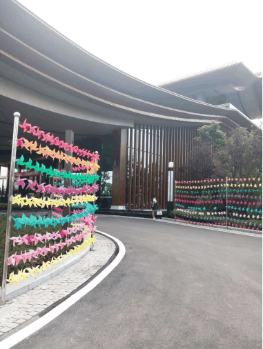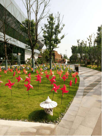 到了龙水湖,因为前一天下了雨,到的时候天好漂亮的,还有很像格桑花的花开得正娇艳!水乐园在绿地上到处都插得有七彩小风车,很漂亮!