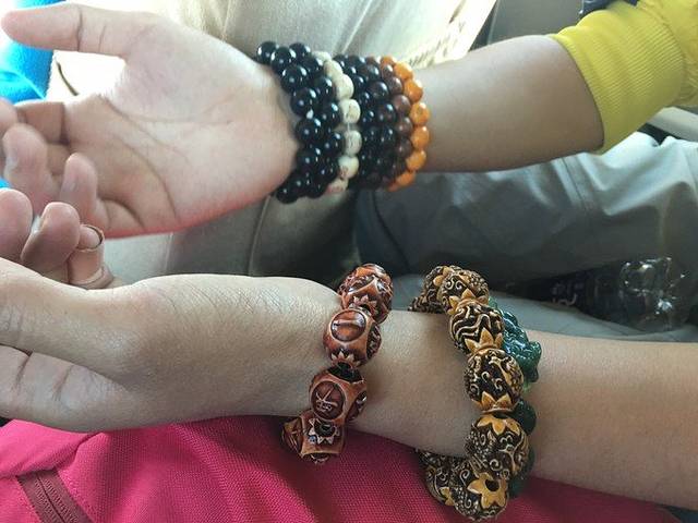 通过软件约到了车,在石窟最外面的大桥上车。蜗牛走出来的时候,被几个卖首饰的大姐抓住不放,硬把各种手环往蜗牛手上套,最后蜗牛因为无法拒绝大姐们的美色诱惑,所以掏钱全部买下,以求获得大姐们的芳心,但是未果。
