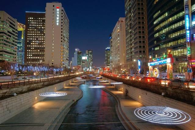 喜欢传统工艺饰品的朋友们一定不要错过,在这里可以看到许多漂亮的小饰品,顺着仁寺洞走出来不远的地方就可以看到清溪川了,清溪川是处于首尔市中心的一条小河,虽然面积不大但是却在炎炎夏日为人们带来了一丝清爽的感觉