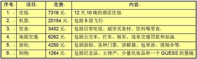 注:合计费用中不包括机场免税店买的化妆品、烟以及奢饰品等,每个人或者每对情侣在这部分的花销上差异巨大,且对其他人旅行来说没有什么参考意义。