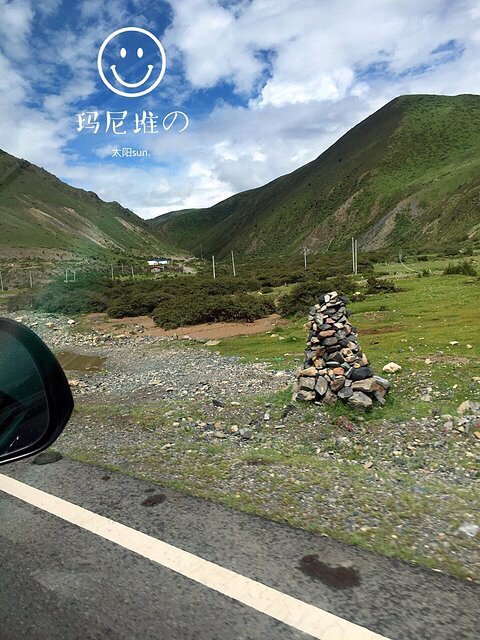 碎石块堆成一堆,布上经幡,每次路过时就在石堆上垒上一些石块,然后绕“尼玛堆”顺时针走三圈,祈求上天保佑。