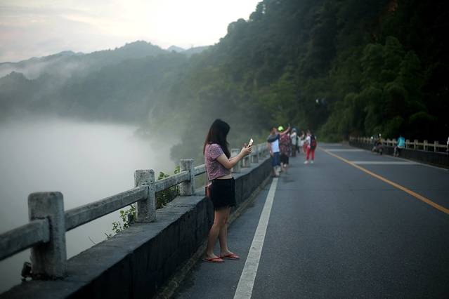 沿着3号桥的马路边,看着江边栈道上的人有的座在船上拍摄,有的穿着古装在岸边摆POS ,苦于只有一个定镜头只能拍拍大片中最精华那一面,七点半决定去下一个景点高椅岭,马路上很多搭客的摩的 随便叫了辆往东江客运站.