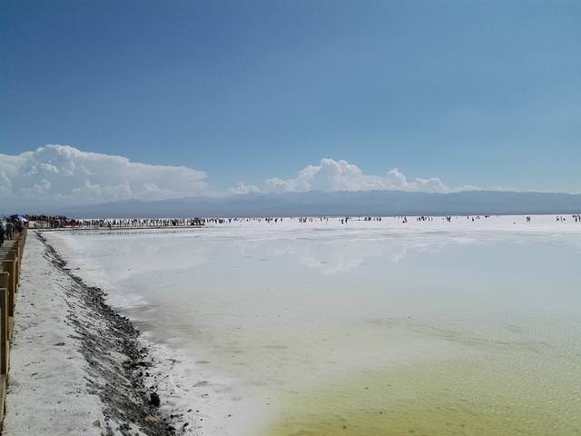 茶卡盐湖~这里的析出的盐是工业用的,它原本是个盐场,后被开发了~但景色还是不错的~在导游的卖力宣传下,来到这里的人们(特别是女性)都穿上艳丽的服饰,站在刚刚没过脚踝的盐湖里,尽情的拍着美丽的倒影~