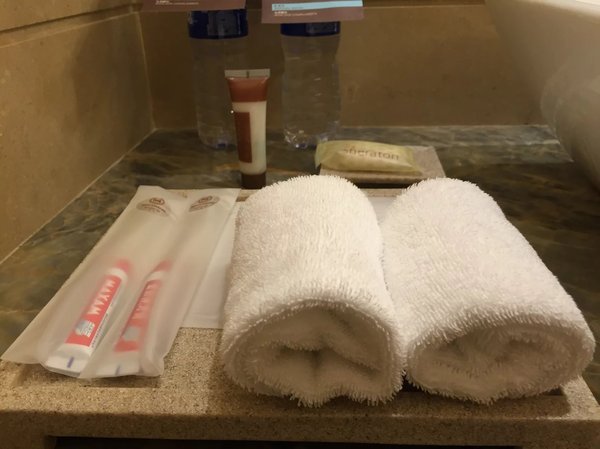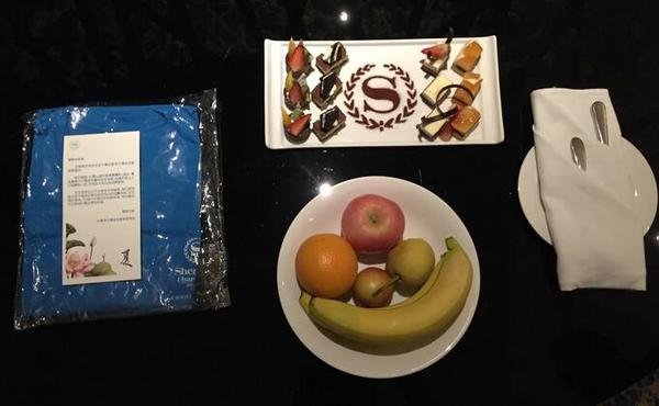 》》》打开房门看到意外惊喜,一眼就看到酒店特地准备的欢迎水果和糕点,糕点盘里最亮的就是Sheraton的“S”,真是非常精致太用心了。