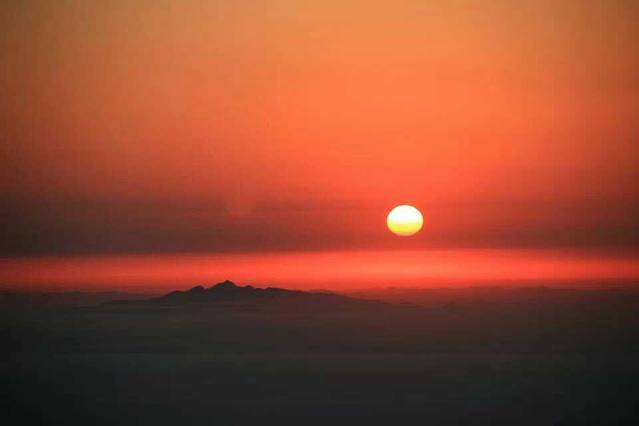 那一刻,眼睛突然感到一丝红润。这红润是来自于这温暖的日光的渲染,是来自于一个登山者攀登一夜来期盼的释放,是来自于对那遥远家的思盼。看着山顶红光,我却渐渐的想到了温暖的家......