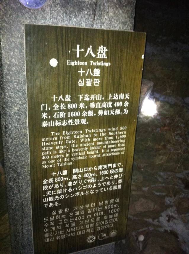 继续前行,凌晨3点左右,我们终于来到了声名远扬的十八盘。十八盘是泰山登山盘路中最险要的一段,共有石阶1827级,垂直高度达400多米,势如天梯,也是登山者最后一道难关。 到达此处的登山者,经过数个小时的攀爬,大多体力消耗殆尽,再加上近2000个阶梯的连续考验,很多登山者在此处都非常吃力,甚至感到阶梯在这里没有尽头。补充能量,一罐红牛一个士力架一个火腿肠。征服十八盘!